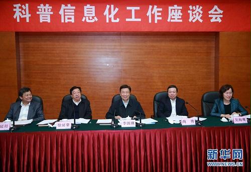 下午座谈时,中国科协党组成员、书记处书记徐延豪代表中国科协作了科普信息化进展情况的汇报,新华网、腾讯、百度等企业,上海、新疆科协负责人,科技工作者代表发言交流。李源潮说,科普工作要与时俱进保持技术先进性、手段先进性和理念先进性,适应社会变化保持与群众的紧密联系,科普方式、科普阵地要与群众活动空间一起转移,特别要跟着青少年的兴趣走。要抓住国家事业发展、社会信息化建设和市场机制创新的机遇,推动科普事业加快发展。以科普信息化为核心,制定好“十三五”时期科普发展规划并纳入国家发展规划。抓好科普信息化龙头工程和示范项目,建好网上科技馆,提升数字科技馆,线上线下有机结合,进社区、进乡村、进中小学、进家庭,让群众特别是青少年能用、好用、常用。宣传表彰和鼓励更多科技工作者献身科普事业,做科普志愿者。