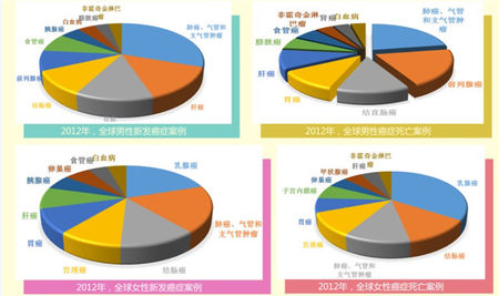让人闻之色变。实际上,全世界癌症患者的案例的确不在少数。2015年2月,美国《化学文摘》(CA)在线发布《2012年全球癌症统计》:2012年,全球约有1.41千万新发癌症病例,820万患者死于癌症;其中57%的癌症患者以及65%的癌症死亡患者来自于发展中国家。肺癌、肝癌、结肠癌、前列腺癌等是男性的大敌,而女性癌症案例则多发于肺癌、乳腺癌、结肠癌、宫颈癌。