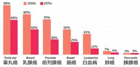 ▼眼下,在癌症中存活的人数超过了以往的任何时候,但是对于某些类型的癌症,存活率却还是太低,此图是英国的癌症病人在70年代和2000年的五年存活率。