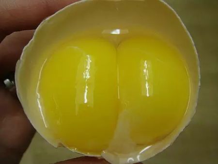 在完全发育的健康母鸡中,这个生产流程配合得很好。但是,对于那些刚开始下蛋的母鸡,各部位的配合还不熟练,就可能出现“异常”。比如,产生了一个卵黄之后,“控制中心”没有收到信号,于是又产生一个卵黄。两个卵黄进入输卵管,虽然增加了后续部门的负担,但这些部门稍微加点班,还是能够正常工作。于是,这两个卵黄被蛋白包裹、成形,排出体外,双黄蛋就这样产生了。