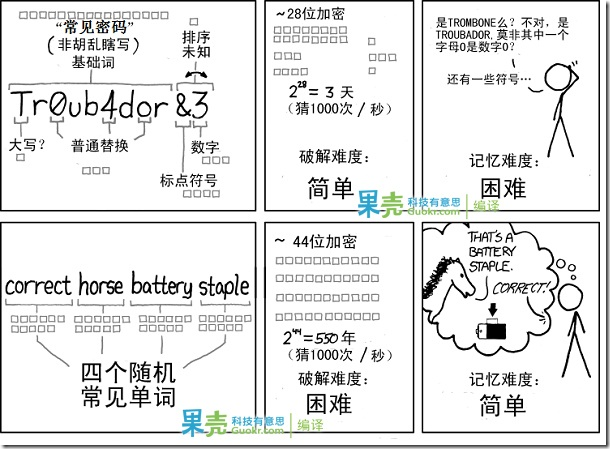 这就正如 XKCD 所说的那样:经过二十年的努力,我们成功地陷入一个误区,那就是把密码设的越来越难以记忆,然而却被计算机很轻松地就破解出来了。