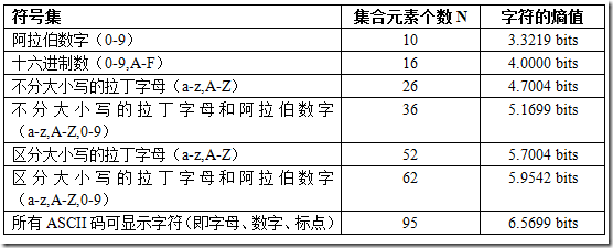 这里引入信息学中的信息熵(我们常听人说这个信息多、那个信息少,对信息“多少”的量化就是信息熵),用它来作为密码强度的评估标准。信息熵计算公式为 H = L * log 2 N,其中,L表示密码的长度,N的取值见下表: