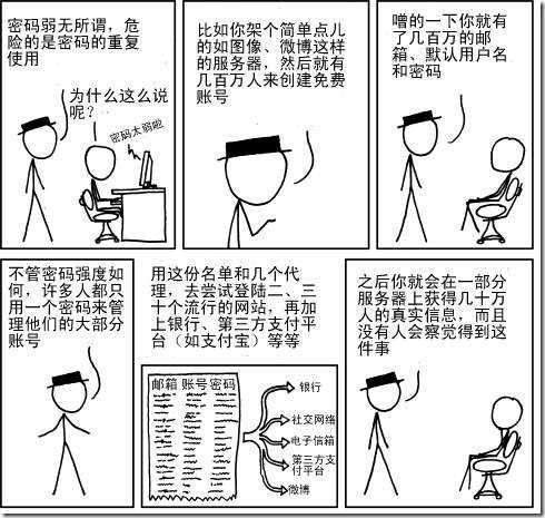 而要说的是,许多人都意识到了这点,并且为了避免这种情况,相当一部分人选择将密码分为两部分,一个主要部分(比如是 123456 ),另一部分则根据账户而定: QQ 的密码就设为 qq123456 ,而 gmail 的密码则是 gmail123456 等等。但如此直白的设置,颇有掩耳盗铃的味道,一旦一个账户失窃,看穿这个规律,也不过一秒的事情而已。