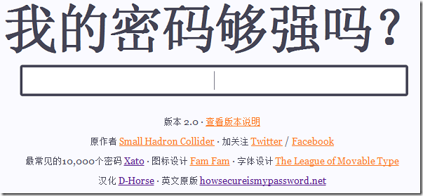 关于密码的问题,在果壳的 小组 中有一个欢乐的讨论。本文的作者 汉化了 “How secure is my password” 这个网站 , 来测测 你的密码用普通的电脑,花多少时间才会被暴力破解掉吧。