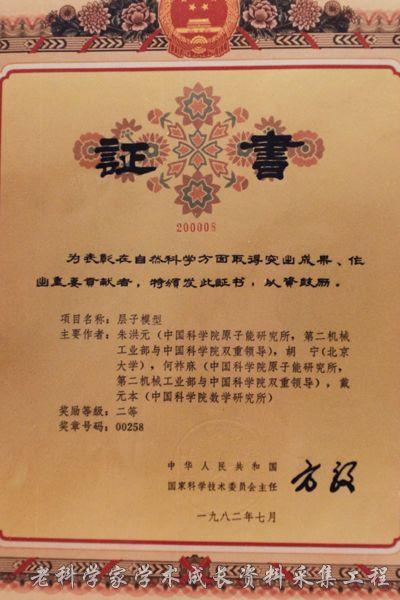 1982年朱洪元、胡宁、何祚庥、戴元本因在“层子模型”研究中的突出贡献获得国家自然科学二等奖