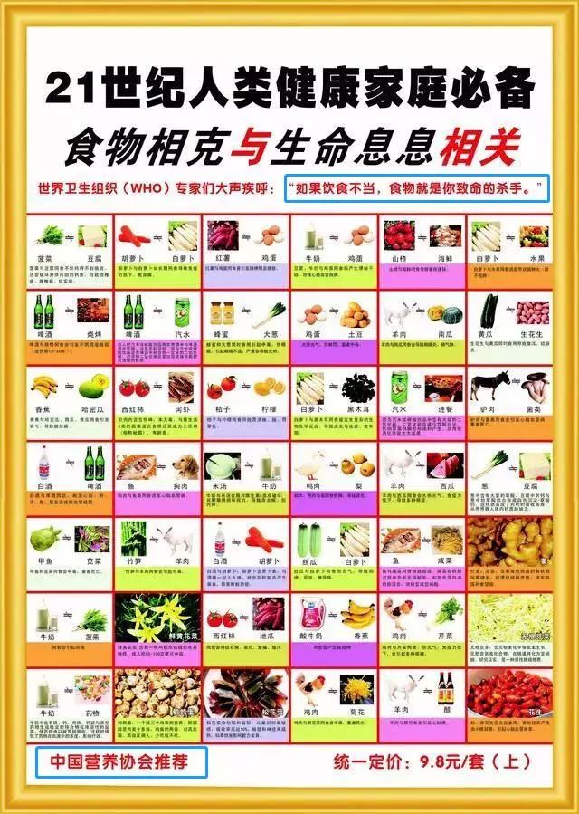 我们看到,上图这张食物相克表,是中国营养协会推荐。