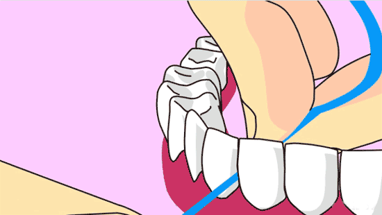 牙线进入牙间隙后分别向口内、口外压紧牙线,左右拉动牙线,轻柔地上下彻底清洁前、后牙齿的邻面。然后向咬合面把牙线提拉出来。重复以上步骤,直到清洁好每一个牙邻面。