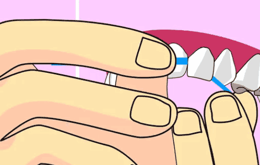 把牙线放在两颗牙齿之间的牙缝,向牙龈方向轻柔地施加压力,左右拉动牙线,使牙线顺利滑入牙间隙。切忌使用暴力把牙线压进牙间隙!
