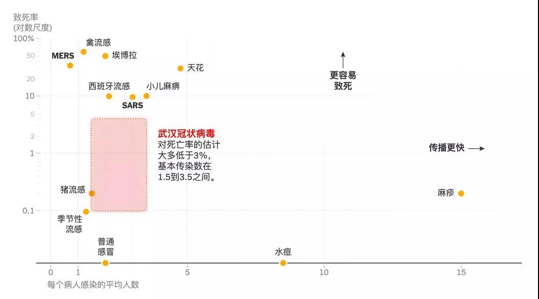 2019-nCoV(估计)与其他病毒平均致死率和传播数比较 | 来源:纽约时报