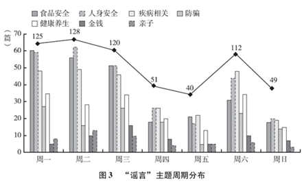 将这625条“谣言”文章按照周一到周日分类分析后发现,周一到周三是“谣言”文章出现的峰值阶段,周二达到顶峰。临近周末“谣言”文章数量会出现一个明显的下降,随后在周六又出现另一个小高峰。