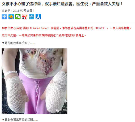 最近,一则消息在网络上广为流传,说的是日前英国一名女孩在同家人野外度假的时候,由于顺手拔除了几株被称作“大豕草”的植物,接触到了植物流出的汁液,由此引起手部、脸部皮肤起水泡和破损。网上消息还称,如果这种汁液溅入或摩擦到眼里,更可能导致暂时或永久性失明。因此网文中警告道“大家不要以为这种事情发在国外,因为大豕草最初是从亚洲引入欧洲的。留意您身边,告诫孩子远离这种草!”