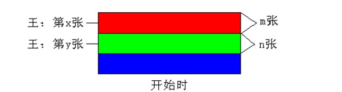 然后表演者要求第一位观众从牌里拿走大约1/3的牌,并且把这1/3的牌的最底下那张展示给观众看,但表演者自己无法看到,再要求第二位观众从剩下的牌里拿走一半(也大概相当于整副牌的1/3),同样把最底下的牌展示给观众看。假设第一位观众最底下的牌是原来整叠牌里从上往下数的第m张(也就是说第一个人拿走了m张牌),而第二位观众拿走了n张牌。如下图所示: