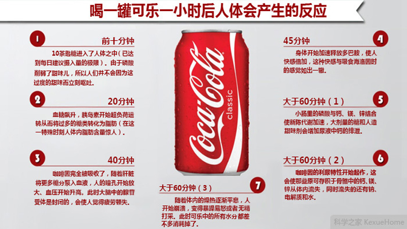 这张图向人们展示了喝一罐可乐一小时后人体会产生的反应。