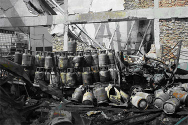 如果是房间里还有别的液化气罐,爆炸产生的冲击波会导致罐体受损而泄漏,从而引发二次爆炸——这就是为什么安全须知上都会提醒,厨房里最好只存放一个液化气罐,用完再及时更换。当然,很多商家为了营业方便,屋子里摆着几个大液化气罐也是常事,但显然很不安全。