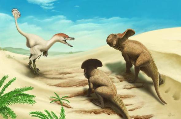 所以,伶盗龙不会集体行动,个子也不大,脑子也不灵,速度还不快,那它是怎么生存下来的呢?靠攻击体型比它还小的恐龙——比如只有家猪大小的原角龙。