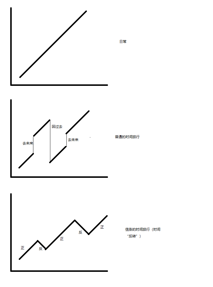 《信条》使用了大量的时间旅行。但是,这个时间旅行和其他科幻题材里常见旅行不太一样。普通的旅行,是你瞬间或者超高速跳跃到时间线上另外一个点,一旦跳跃完成,之后的事情就和往常一样。但信条里特别强调了自己不是普通的时间旅行,而是“时间逆转”,不存在跳跃,所有人都是全程维持每秒一秒的速度,只不过有些人的方向和别人是反的。