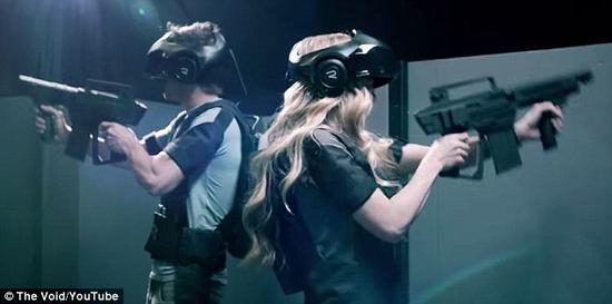一个被称为“虚空”的虚拟现实主题公园将于2016年正式开业,届时将为玩家提供两个级别的沉浸式视频游戏。图中是两名头戴虚拟现实头罩、手持虚拟枪械的游戏玩家。