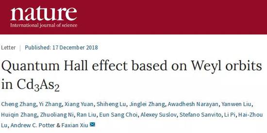 北京时间12月18日零点,相关研究成果以《砷化镉中基于外尔轨道的量子霍尔效应》(“Quantum Hall effect based on Weyl orbits inCd3As2”)为题在线发表于《自然》(Nature, DOI:10.1038/s41586-018-0798-3。)。修发贤为通讯作者,复旦大学物理学系博士生张成,复旦校友、康奈尔大学博士后张亿和复旦大学物理学系博士生袁翔为共同第一作者。