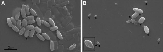 电镜下的枯草杆菌芽孢。图片来自:http://aem.asm.org/content/79/18/5527
