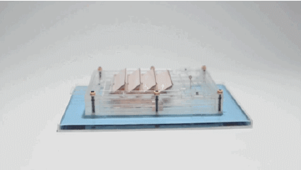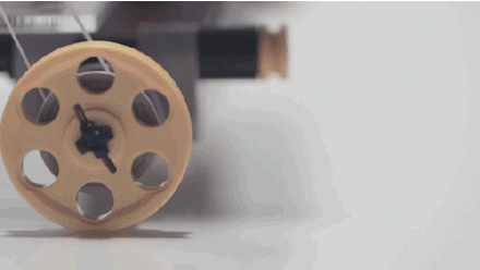 接下来,只要将这些“人工肌肉”元件组合起来,再控制局部湿度的变化,它们就可以带动各种驱动装置运行了。研究者们把许多薄膜组装成轮状,并在其中加入提供水蒸气的潮湿表面,就做成了一个小小的“蒸发驱动引擎”。随着潮湿表面水分的蒸发,引擎被变形的薄膜带动旋转,其动力可以带动一辆0.1千克重的微型小车。