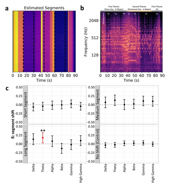 研究团队还观察到,当被试听到K448一段长而重复的乐节结尾时,一种被称为θ波的电活动在其前额叶皮质区增加。过去的研究认为,θ活动或与对音乐的积极情感反应有关。