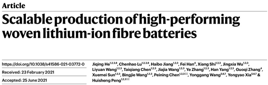 北京时间9月1日23时,顶级学术期刊《自然》(Nature)在线发表了复旦大学高分子科学系彭慧胜教授团队的一项最新研究,题为《高性能纤维锂离子电池的规模化构建》(“Scalable production of high-performing woven lithium-ion fibre batteries”),该研究发现了纤维锂离子电池(FLIBs)内阻与长度之间的关联规律,有效解决了活性材料和纤维电极界面稳定性难题,连续构建出兼具高安全性和高性能的新型纤维聚合物锂离子电池。