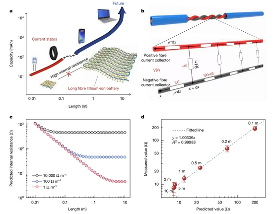 最后他们将长度拓展至10米。论文显示,当纤维长度范围更广,在0.01米至10米时,内阻也会下降。这些结果意味着,获得高性能的长纤维锂离子电池是可能的。