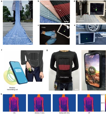 a-e) 通过纺织方法获得高性能和高安全性的纤维锂离子电池织物;f-h) 纤维锂离子电池织物为智能手机进行无线充电。