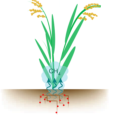 缺氧的环境、大量的有机物和温暖的环境,使得水稻根际土壤中产生大量厌氧型微生物。而这些微生物中,就包含相当多的产甲烷菌。整个水田,就好似一个巨大的无盖沼气池,源源不断的将有机物分解为甲烷,并肆无忌惮的排放入大气之中。