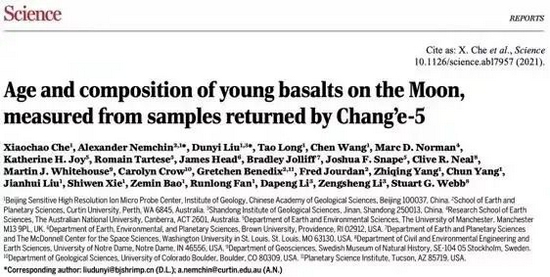 相关研究论文《嫦娥五号年轻玄武岩的年代与成分》,于北京时间10月8日凌晨在线发表于国际学术期刊《Science》上。这是以嫦娥五号月球样品为研究对象发表的首篇学术成果。