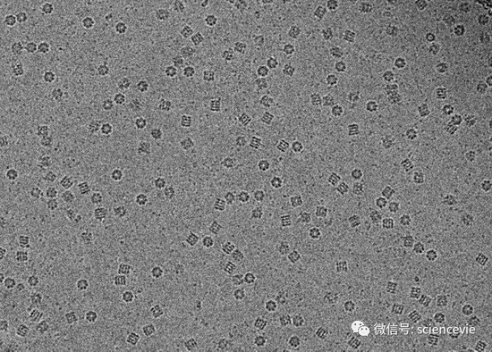 悬于低密度无定形冰中的 GroEL 蛋白。在水中纯化蛋白质,然后将一片穿孔的膜浸入该蛋白质溶液,从而使蛋白质在其孔隙中伸展并充分勾勒出自身结构。最后,将所有物质浸入 -182℃的液态乙烷中。快速的冷却过程使水以玻璃态凝结,如同一块保护性的脉石般包裹着蛋白质。