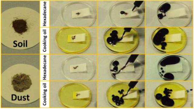 油中实验过程。污垢分别使用公园里的土壤(Soil)和室内的灰尘(Dust)充当,油选用十六烷(Hexadecane)和食用油(Cooking oil)。经过疏水涂料处理的表面被部分浸润在油中,界面处撒有污垢。之后,研究者向表面滴水(为了便于分辨,水被事先染成蓝色),以清除表面上的的污垢。 图片来源:详见参考文献[5]