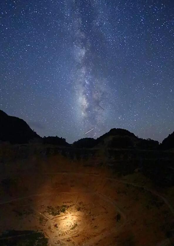 20年前,为FAST寻找台址的朱博勤在崎岖的山路上跋涉了两个多小时,爬上“大窝凼”的垭口,映入眼帘的是:青山环抱着一片圆圆的洼地,山上绿树葱郁,山谷内灰瓦木屋点缀在农田之间,鸡犬之声不绝于耳。这里有个好听的名字:绿水村。12户人家65口人居住在连电都不通的封闭小世界里,在寂静晴朗的夜晚,有时也抬头望望散布穹顶的星辰。