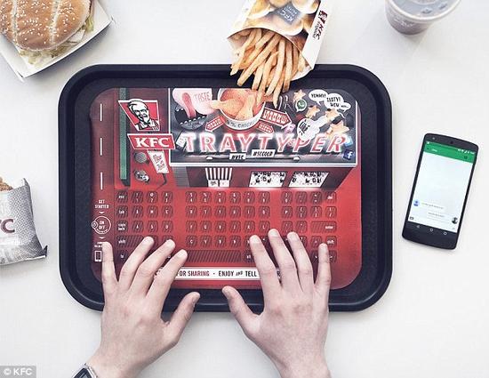蓝牙托盘垫 肯德基推出了一种内置键盘的新型蓝牙托盘垫。有了它,你就可以尽情享用一桶额外的炸鸡,而不用担心评论Facebook的新帖子会弄脏自己的手机。 -