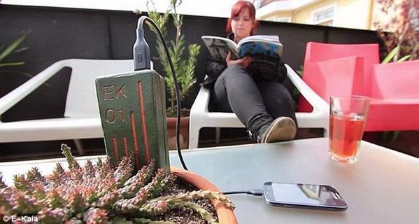 插到土壤里给手机充电 智利几位工程师最新研制一种生物充电器,只需将手机、平板电脑等设备充电线插入室内植物土壤中便能充电。 -