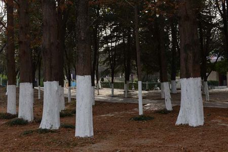 树干为啥要穿"白裙" 树干穿上石灰水打造的白裙后,能把40~70%的阳光反射回去,如此这般,吸热减少,树干就不会因昼夜温差巨大而冻裂,同时还有杀菌和防虫的作用。 -