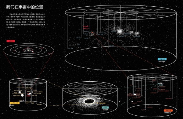 我们在宇宙中的位置 当发现头顶上的星空重复着一个巨大的周期之后,我们逐渐认识到,我们是一个巨大体系的一部分,而这一体系比太阳系以及那包含2000亿颗恒星的银河系要大得多得多。 -