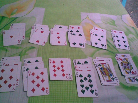 玩法是先把扑克54张牌中的两个王、四个K去掉,然后把剩余的48张牌洗牌后分成背面向上的十二叠,每叠四张,这十二叠分别代表未来一年的十二个月。接下来,抽出第一叠最底下的一张牌并翻开,按照牌上面的数字放到相应月份的那叠牌上方,比如数字是2,就放到第二叠代表2月的牌最上方;数字是J,就放到第十一叠代表11月的牌最上方,然后把放牌的那叠牌最底部的一张牌抽出并翻开,同样地按照数字放到相应月份的牌上。这样一直下去,直到四张A全部翻出,一局游戏就停止了。此时看一下,哪个月份的四张牌全部翻开了,就代表那个月会有好运,如果十二个月全部被翻开,则预示着未来的一年每天都会幸福快乐。