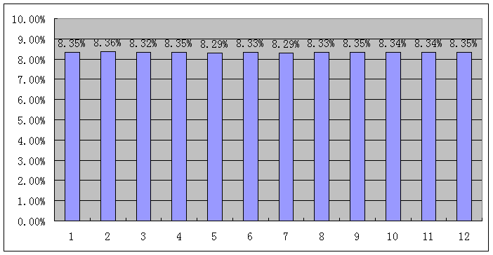 为了让大家相信,“摆十二月”的概率真的是这样的,作者在电脑上编写了一小段程序,模拟了一百万局“摆十二月”游戏的结果,当然这在电脑上运行也只花费了不到十秒时间而已。下面是一百万次“摆十二月”中有多少个月开了的百分比的分布,可以看到无论只有1个月开的结果还是12个月全开的结果出现的次数都非常接近,平均大约有6个或者7个月会开。
